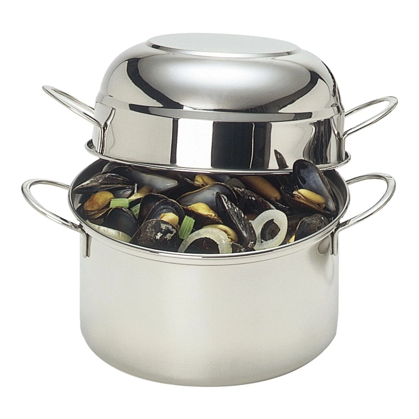 De mosselpan, een keukenmonument, speciaal voor jou in mooi blinkend kwalitatief roestvrij staal. Of je nu van mosselen met witte wijn, pastis, room, gewoon puur natuur of naar een aloud recept van je familie houdt, deze handige pan (20 cm diameter) klaart de klus zoals het hoort op elk fornuis, inclusief inductie. Dankzij die mooie dampende zilte portie waan je je zo aan de kust. Op en top genieten. En de lege schelpen? Die drop je gewoon in het handige, diepe deksel.