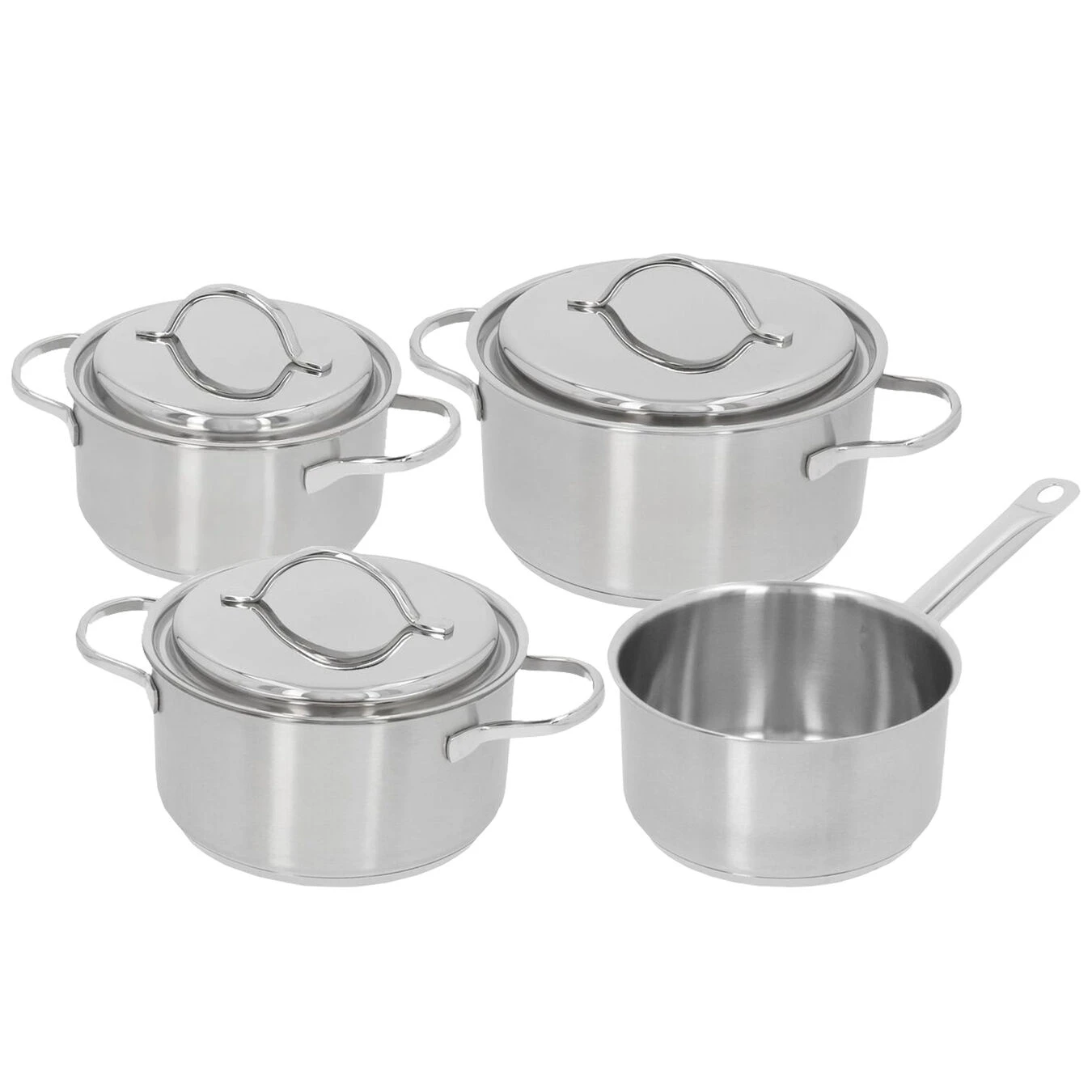 Goed materiaal is de helft van je kookpret. Met deze kwalitatieve Resto 3 startset haal je de basics in huis om eten te bereiden voor je gezin of voor jezelf en enkele vrienden. De drie kookpotten (16, 18 en 20 cm doorsnede) hebben een goed passend blinkend deksel dat mooi contrasteert met het matte roestvrij staal. Sauzen bereiden lukt prima in de stevige steelpan (16 cm). Net zoals bij de degelijke kookpotten wordt de warmte gelijkmatig verdeeld in de bodem. Zo kook je snel en efficiënt bouillons en sauzen in. Ook ideaal voor het smelten van boter en om eieren of vis te pocheren. Dat kan op eender welke kookplaat, ook inductie. Deze potten en pannen kunnen zelfs probleemloos in de oven. Daarna was je ze moeiteloos af. De stevige grepen zijn zo gelast dat er geen vuil tussen kan.