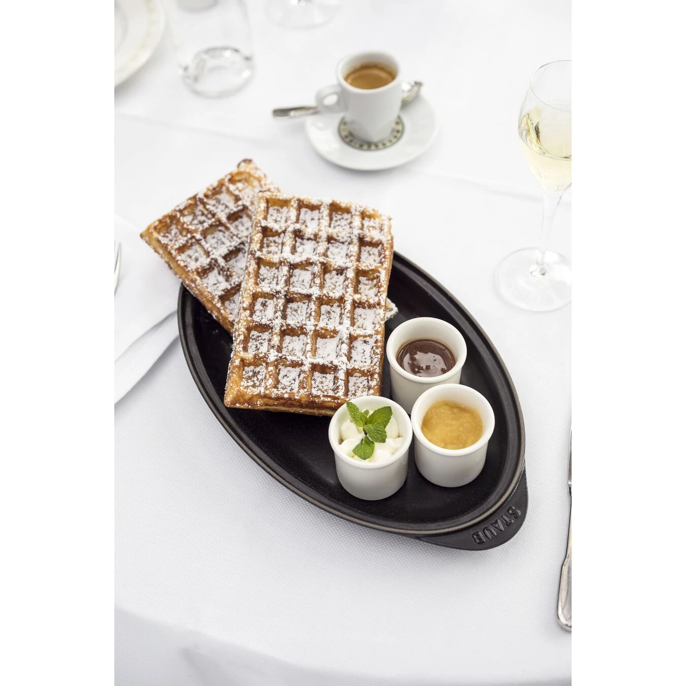 Zet uw visgerechten rechtstreeks uit de oven op tafel. In de gietijzeren vispan uit het Staub assortiment gaart u lekkere vis op zachte wijze en zet u het gerecht meteen na het bereiden op tafel. Het ovale, elegant zwarte ontwerp vestigt de aandacht van al uw tafelgasten op een stijlvolle manier op uw visgerecht. De ovenschaal heeft een inhoud van 0,7 l en ziet er door de opvallende messing knop zeer mooi uit. In het deksel zitten nopjes die het gecondenseerde vocht terug op de vis laten druppelen. Zo blijft de vis sappig tijdens het garen en komen de smaken volledig tot uiting. De schaal is 36 cm lang (inclusief handvaten), 8,4 cm hoog en 20 cm breed. Net zoals de andere producten van Staub valt deze ovale vispan op door haar moderne interpretatie van de klassieke Franse keukenstijl. Het materiaal is robuust en gemakkelijk te reinigen, waardoor u vrienden en familie moeiteloos verwent met een lekker gerecht én het in stijl op tafel presenteert.